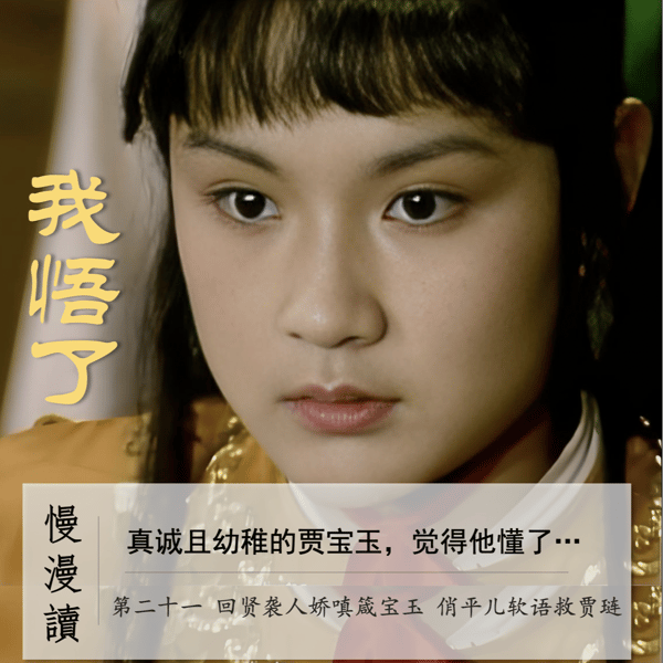 慢漫读第21回 贤袭人娇嗔箴宝玉 俏平儿软语救贾琏 宝玉真的很累,上一回和黛玉小吵一番,而后又要调停湘云和黛玉的「爱哥哥」之争。而这一次又要面对小小吃醋大大生气的袭人,搞不清楚袭人为何生气,闹不明白女人的心为何如此复杂。 何以解忧,唯有读书,一篇《南华经》让宝玉假开悟,真幼稚。 我懂了,我真的懂了。 不要错过 * 贤袭人生气 既是吃醋又是失望 * 傻宝玉迷茫 不知袭人为何生气 * 宝玉的嘴骗人的鬼 规劝早忘记 * 宝玉耍少爷脾气 给丫头起外号 * 宝玉喜聚不喜散 思想剑走偏锋 * 寻找...