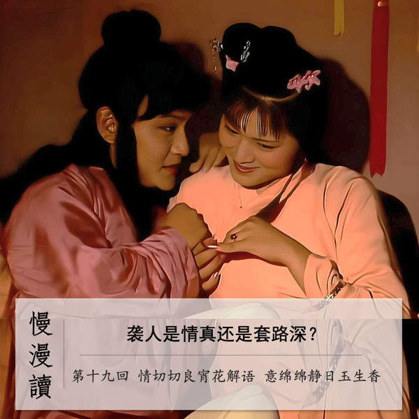 慢漫读第19回 情切切良宵花解语 意绵绵静日玉生香 感谢【丝丽小红帽】对本期节目的大力支持。点击进入专属购买链接:https://mo.m.tmall.com tips:大促期间品牌方给了多重福利,下单即可享受!!! 省亲结束,红楼梦的故事进入了新的阶段;文笔大变,日常细节进入了书中书写的重点。 贾宝玉在party中溜走闯进了袭人的家,当晚一场关于袭人要离开贾府的“辩论”悄然展开。套路一层一层,到底是清醒逻辑战胜模糊思绪,还是女人心海底针的用心试探,我们一一细读。 不要错过 * 新的章节:从宫...