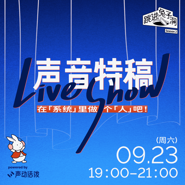 本活动由 Tezo 通勤耳机赞助举办 我们想邀请大家来到线下,收听、观看和参与一场「跳进兔子洞」节目的现场制作。 期待在秋天的北京(活动当天正好是秋分耶)和你见面! 参与方式 请添加声小音微信咨询(shengfm1) 活动主题 在「系统」里做一个「人」吧! 你将会听到: 一个北京人的一段辛酸停车史 一个 30 岁单身女性对于高端婚恋市场的探索 一支业余女足球队里的「奇葩」男教练 一个嗑女CP上瘾的女通讯录如何从上头走向崩溃? 活动时间 2023 年 9 月 23 日,19:00-2...