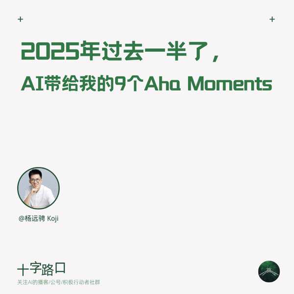 2025 到现在的这半年,从 DeepSeek r1 到 Manus 到 GPT-o3,几乎每一周、甚至每一天,AI 行业都在迅速进化。 本周的十字路口播客,不是创业者的访谈,而是 Koji 个人在年中的一期分享,关于最近半年我在 AI 领域感受到的 9 个 Aha Moments —— 包括但不限于一个技术的突破、一次产品的发布、一位创业者的故事。 本期内容不是在分享大模型最前沿的新知识,也不是在尝试做某种 Top 10 产品榜单,而是分享我身处一线,每天与创业者交流、体验产品后的个人感受。 这些感受...